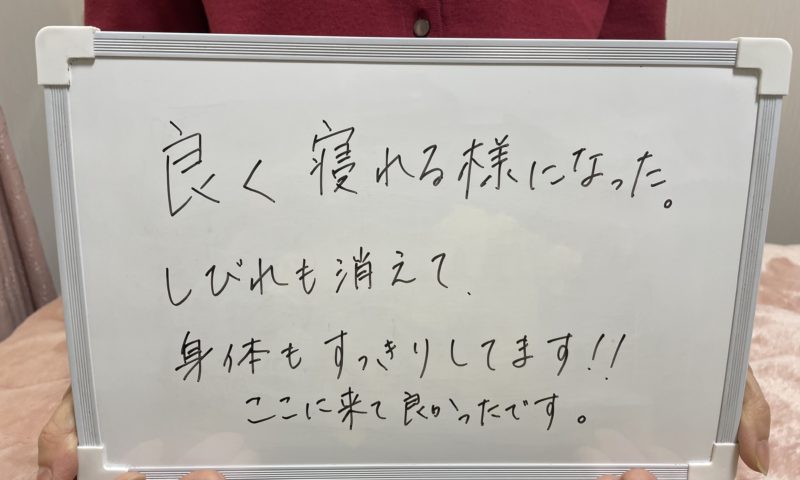 リラクゼーションKISEKIです。 今回で4回目の施術(女性50代) 全身の不調でお悩み! ・両手のシビレ、耳鳴り、不眠症 ・右股関節痛、頭痛、眼精疲労など…etc